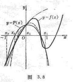 First select three points on the x -axis: x 0 , x 1 , x 2 , through the three points on the curve y = f ( x ) : ( x 0 , f ( x 0 )), ( x 1 , f ( x 1 ) ), ( x 2 , f ( x 2 )) as a parabola y = P ( x ) (i.e. Lagrangian interpolation polynomial, see Chapter 17, § 2 , 3), the parabola and xThe axis has two points of intersection, take the point closer to x 2 as x 3 ; then three points ( x 1 , f ( x 1 )), ( x 2 , f ( x 2 )), ( x 3 , f ( x 3 )) to draw a parabola ( dotted line in Figure 3.8 ), which has two intersection points with the x -axis, take the point closer to x 3 as x 4 L , and make points x i -2 , x i - according to this method 1 , x i , after three o'clock (x i -2 , f ( x i -2 )), ( x i -1 , f ( x i -1 )), ( x i , f ( x i )) as a parabola has two intersections with the x -axis, Take the point closer to xi as xi +1 , and so on .