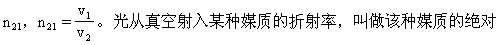 第一媒质)的折射率称为这媒质的“绝对折射率”,简称“折射率”。由于光在真空中传播的速度最大,故其他媒质的折射率都大于1。同一媒质对不同波长的光,具有不同的折射率;在对可见光为透明的媒质内,折射率常随波长的减小而增大,即红光的折射率最小,紫光的折射率最大。通常所说某物体的折射率数值多少(例如水为1.33,玻璃按成分不同而为1.51.9),是指对钠黄光(波长5893×10-10米)而言的。