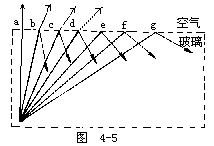 【全反射】 光由光密(即光在其中传播速度较小的)媒质射到光疏(即光在其中传播速度较大的)媒质的界面时,全部被反射回原媒质内的现象。光由光密媒质进入光疏媒质时,要离开法线折射,如图45所示。当入射角θ增加到某种情形(图中的e射线)时,折射线延表面进行,即折射角为90°,该入射角θc称为临界角。若入射角大于临界角,则无折射,全部光线均反回光密媒质(如图fg射线),此现象称为全反射。当光线由光疏媒质射到光密媒质时,因为光线靠近法线而折射,故这时不会发生全反射。