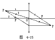 【物像公式】 描述物像位置以及它们和透镜或透镜组的特征量之一(焦距)之间的关系式。对一个薄凸透镜可以认为是由底面朝向透镜中央的许多棱镜的集合,而这些棱镜的顶角是很小的,对于顶角很小的棱镜来说,如果构成棱镜的材料的折射率为n,顶角为A,那么在近轴光线的条件下,其偏向角δ为常数(n-1A。当棱镜给定后,近轴光线的偏向角δ是不变的。我们可以利用此关系来推导薄透镜的物像公式。如图413a所示,设PM为平行光束所任一条光线在M点入射,而OM=h,则出射光线MF′必通过透镜的焦点F′,OF=ff为透镜的焦距。根据近轴光线的条件,即f>>h,偏向角近似为