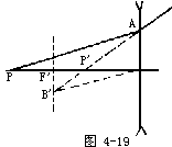 【球面镜成像】 对于凸面镜只能使特成正立、缩小的虚像。如图42a)所示。由物A点出发的平行于光轴的光线,达到镜面后将反射,其反射光的延长线必交球面镜的焦点F上。而从A射向F的光线被球面反射后将平行于光轴。这两条反射线,没有实交点,只有虚交点A′,也就是说视觉认为这两条光线是从A′发出的。物体上的B点发出的沿光轴的光线,即平行于光轴,又过焦点,故B′为B点的像。在物体AB上的各点,接照前述办法作图,其各点的像点都在AB′上,故AB′即为AB的像。无论物AB在何处,它所发出的光射到球面镜后而反射的光,没有实交点,因此所成之像必为虚像。由图中可以看出,物体在轴的上方,所成的虚像也在轴的上方,故所成之像为正立。无论AB在什么位置,从A点出发的平行于轴的光线一定在AF方向的光线的上方。此两线的交点A′必比A点更靠近轴,所以像是缩小的。根据上述方法作图可知凹透镜成像可有三种情况:(1)物在凹镜前二倍焦距以外时,是倒立缩小的实像,见图42b)。(2)物在两倍焦距以内,焦点以外时,则成倒立放大的实像,见图42c)。(3)当物位于焦点以内时,则成正立的放大的虚像,见图42c)。