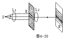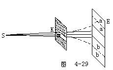 【光的衍射】光绕过障碍物偏离直线传播而进入几何阴影,并在屏幕上出现光强不均匀分布的现象。这种现象也体现了光的波动特征。光的衍射现象是光的波动性的最直接,最有力的实验证据。牛顿的微粒模型难以说明光绕过障碍物时发生的弯曲现象,衍射现象只能用波动说解释。根据惠更斯一菲涅耳原理,不仅可以对光绕过障碍物边缘偏离直线传播的现象作一般性的解释,而且能定量分析衍射图样的发光强度分布。光屏上任意一点的发光强度可根据次波迭加推算出来。因此光的衍射现象是光的波动性的最直接、最有力的证据。如图4-29所示,K是一可以调节的狭缝。从光源S发出的光线,穿过K后,在屏幕E上呈现光斑ab。在SKE三者的位置已经固定的情形下,ab的宽度是由缝的宽度决定的。当狭缝从一定的宽度逐渐缩小时,穿过缝的光束也逐渐变窄,在屏幕E上的光斑ab随之变窄,但是当缝K缩小到一定程度时,屏幕上的光斑不仅不变窄,反而增宽,如图中ab′所示。而且光斑的全部亮度也将发生变化,由原来的均匀分布变成一系列明暗条纹。光斑的边缘也将失去明显的界限,变得模糊不清。应当指出。在图4-29中所示的衍射实验装置中,狭缝距光源和屏幕都很近,所以入射光和衍射光均是非平行光束。在光学中,通常把入射光或衍射光不是平行束的衍射,称为菲涅耳衍射。图4-29所示的单缝衍射情况就是一种菲涅耳衍射。在另一些装置中,如果入射光和衍射光都是平行光束,那末,这种衍射称为夫琅和费衍射。显然,观察这种绕射现象需要利用透镜。