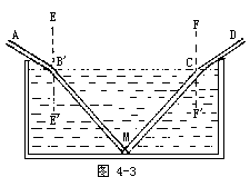 【光的折射】 凡光线在通过疏密不同介质交界面时改变方向的现象,称为光之折射。如图43所示,光线AB由空气内斜向射至水面,自入射点B起,就向这点的法线EE′偏折而取BM的方向。若在水底置一平面镜M,使反射线MC再由水中透入空气,则自入射点C起,离开法线FF′偏折,而取CD的方向。偏折后的光线BMCD,称为折射线,折射线和法线所成的角,如∠EBM和∠FCD,称为折射角。由此可知光线由稀的介质入射到密的介质时,折射线常向法线偏向,故折射角常比入射角小;若由密的介质透入稀的介质时,折射线常离法线而偏向,折射角常比入射角大。当光线通过介质的密度在不断变化时,光线前进的方向也随之而改变,因此我们隔着火盆上的热空气看对面的东西时,会觉得那东西不停地在闪动着。这是由于火盆上面的空气因受热很快地上升,这部分空气的密度便和周围空气的密度不同,而且热度还不断在变化,当由物体射来的光线通过这样的空气,其折射光线的路径不断发生变化,就会使物体变成了闪动的形状。在炎夏中午时分,假使躺在地上来看树木、房屋和人物,它们的轮廓好像是透过一层流动的水一样,而且动摇不定。这是因为那时十分炎热,地面的辐射热很多,温度高,接近地面的空气受热,密度变小,因而上升,成为向上流动的气流,由物体射来的光线通过这种变动着的气流折射光线的路径就不断改变,因此所看到的物便都动摇不定。我们在夜里看到天空中恒星的闪动,也是这个道理。大气里经常存在着密度不同的气流和旋涡,当恒星的光线通过这种气流时,就会使它原来折射的路径发生变化,一会儿到左,一会儿到右,恒星是不会闪动的,都是这折射光造成的。又如太阳位于地平线附近时,光之折射作用尤大。在地平线下的太阳,阳光从太空(真空)平射至逐渐变化的光密媒质空气中而发生的折射,光线传到地面是一曲线,因为光之折射的关系,太阳看上去就如同刚刚接触到地平线的下缘一样,其实它业已落至地平线以下了。同理,当太阳刚刚还在地平线下的时候,看上去它已升起来了。所以我们可以说:太阳实际上比我们肉眼所见的要落得早些而起的迟些;这等于说,光之折射将我们的白天稍稍加长了一点。