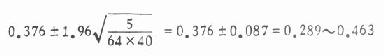 实际资料的方差都小于1/12,故用以推算得的可信区间偏大,假设检验结论比较保守。本例中组与辩中组的区间重叠部分甚少,用表10.14内数值代替1/12,则可得到更为适当的结果。该资料等级数为4,查表10.14得最大方差为5/64故标准误为