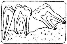 牙周袋形成:由于炎症的扩展,牙周膜被破坏,牙槽骨逐渐吸收,牙龈与牙根分离,使龈沟加深而形成牙周袋。可用探针测牙周袋深度。X线检查时可发现牙槽骨有不同程度的吸收。如图3-7~11.