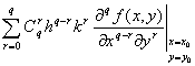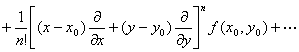 [泰勒公式]  假定在某一点(x0,y0)的邻域D内二元函数f(x,y)有直到n+1阶为止的一切连续偏导数.分别给xy以改变量hk,使连结点(x0,y0)(x0+h,y0+k)的直线段不越出D,那末f (x,y)D内可表成形式: