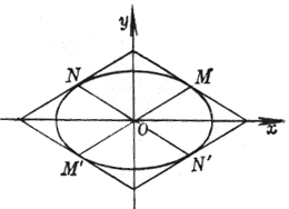 7° 设MM¢ , NN¢ 为椭圆的两共轭直径, 通过M, M¢ 分别作直线平行于NN¢ ; 又通过N, N¢ 分别作直线平行于MM¢ , 则这四条直线构成的平行四边形的面积为一常数4ab(图7.5).