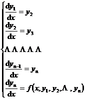 Let y 1 = y , y 2 = y' , y 3 = y" , , y n = y ( n -1) , then solving the above n -order differential equation is equivalent to solving the following n first-order differential equations Group
