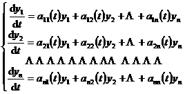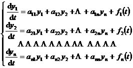 where a ik ( t ) and f i ( t )    ( ) are both known continuous functions of the independent variable t . If at least one f i ( t ) is not equal to zero, then (1) is called an inhomogeneous linear differential System of equations . If all f i ( t ) are equal to zero, then (1) is called a system of homogeneous linear differential equations, and its general form is