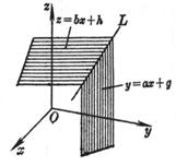 The straight line L is the intersection of the two planes y = ax + g and z = bx + h ; it passes through the point (0, g , h ) and has direction numbers 1, a , b