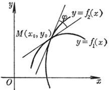 [ Included angle of the curve ]  The slopes of the two curves intersecting at the point and the tangent at the intersection point are respectively and , and the included angle j is called the included angle of the two curves ( Figure 7.14), and